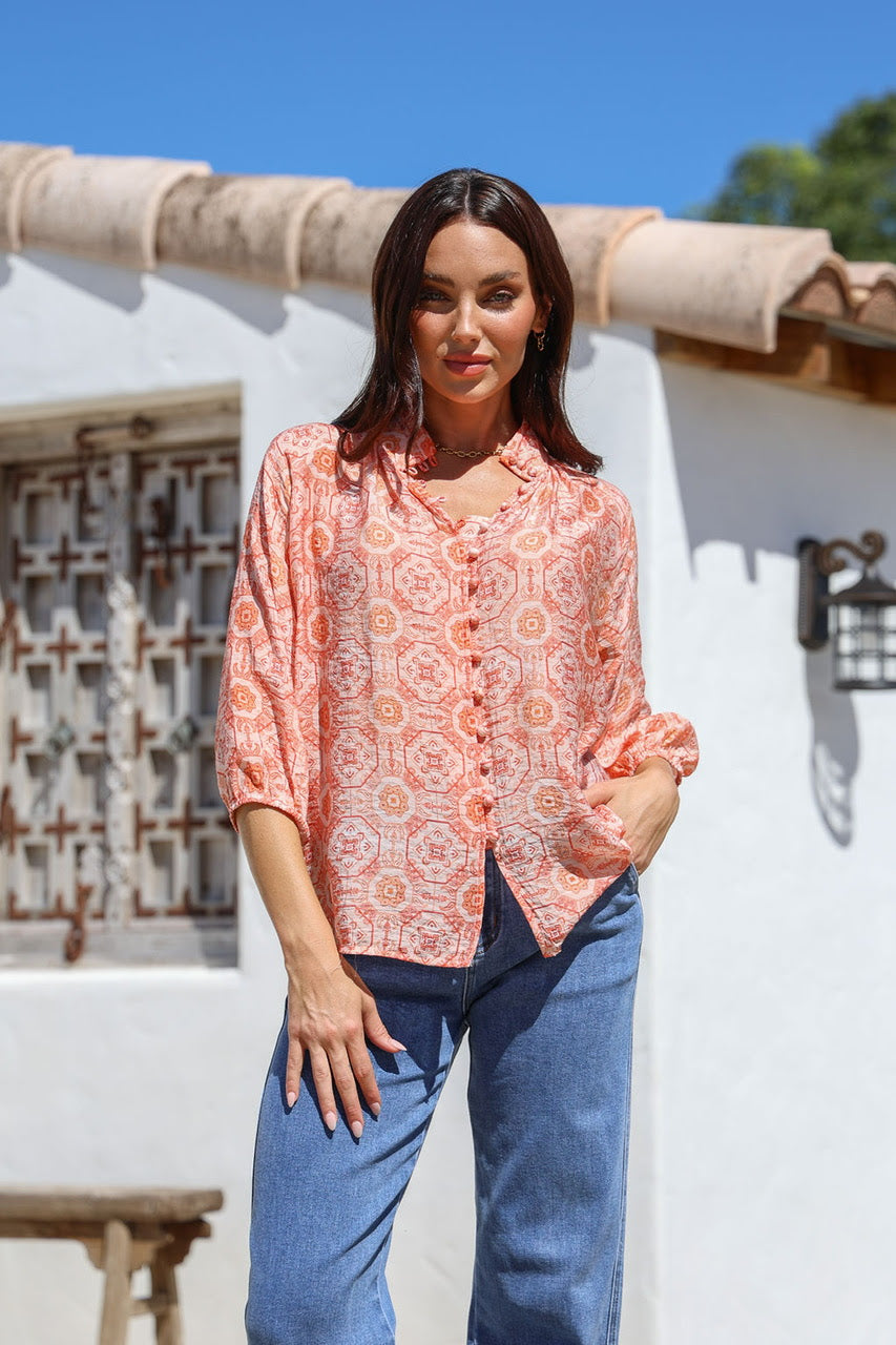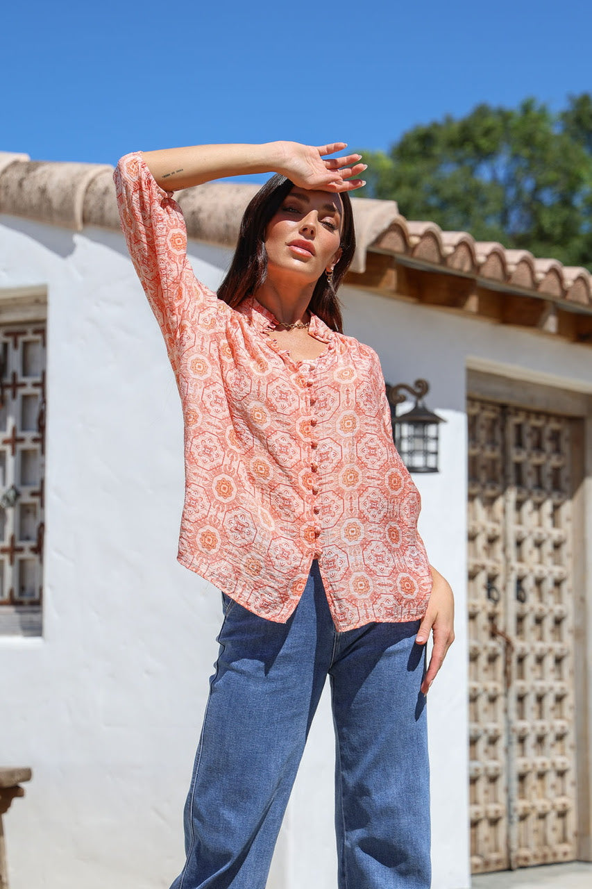 Embrace sunny days with the Malta Blouse in Blush Mango, featuring a cheerful button-front design and comfy elastic cuffs. Its light, breezy fabric brings playful spring and summer vibes to your wardrobe, perfect for effortless style on warm days.