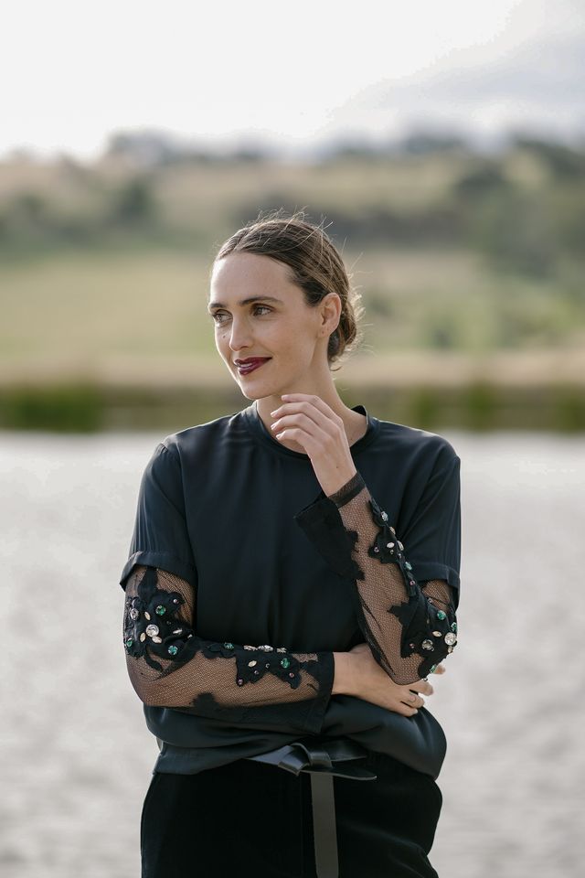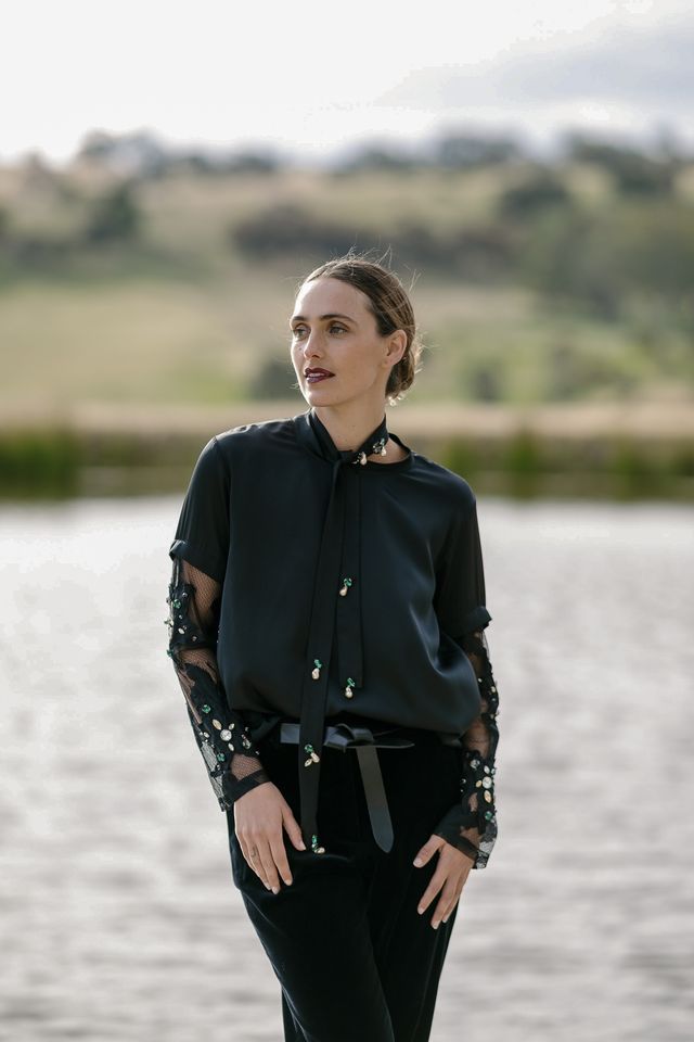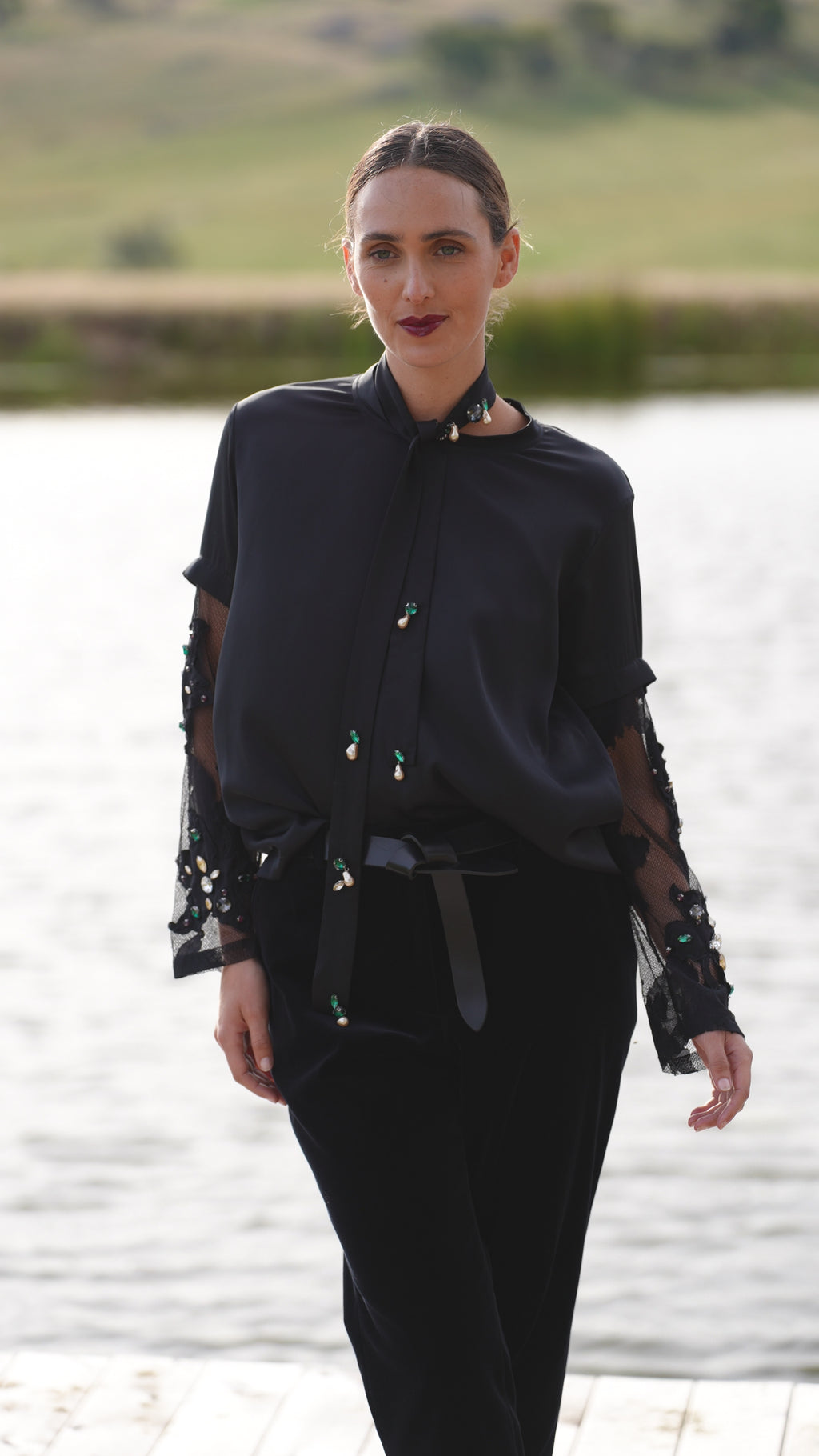 Elevate your everyday with this silk top, crafted by M A Dainty in a versatile black. Delicate lace sleeves adorned with crystal beading add an unexpected touch of refinement, while the round neckline keeps the silhouette effortlessly balanced. Transition seamlessly from day to night—pair with denim for casual elegance or black trousers for polished sophistication. Complements the Tara embellished tie beautifully for a curated, editorial look.