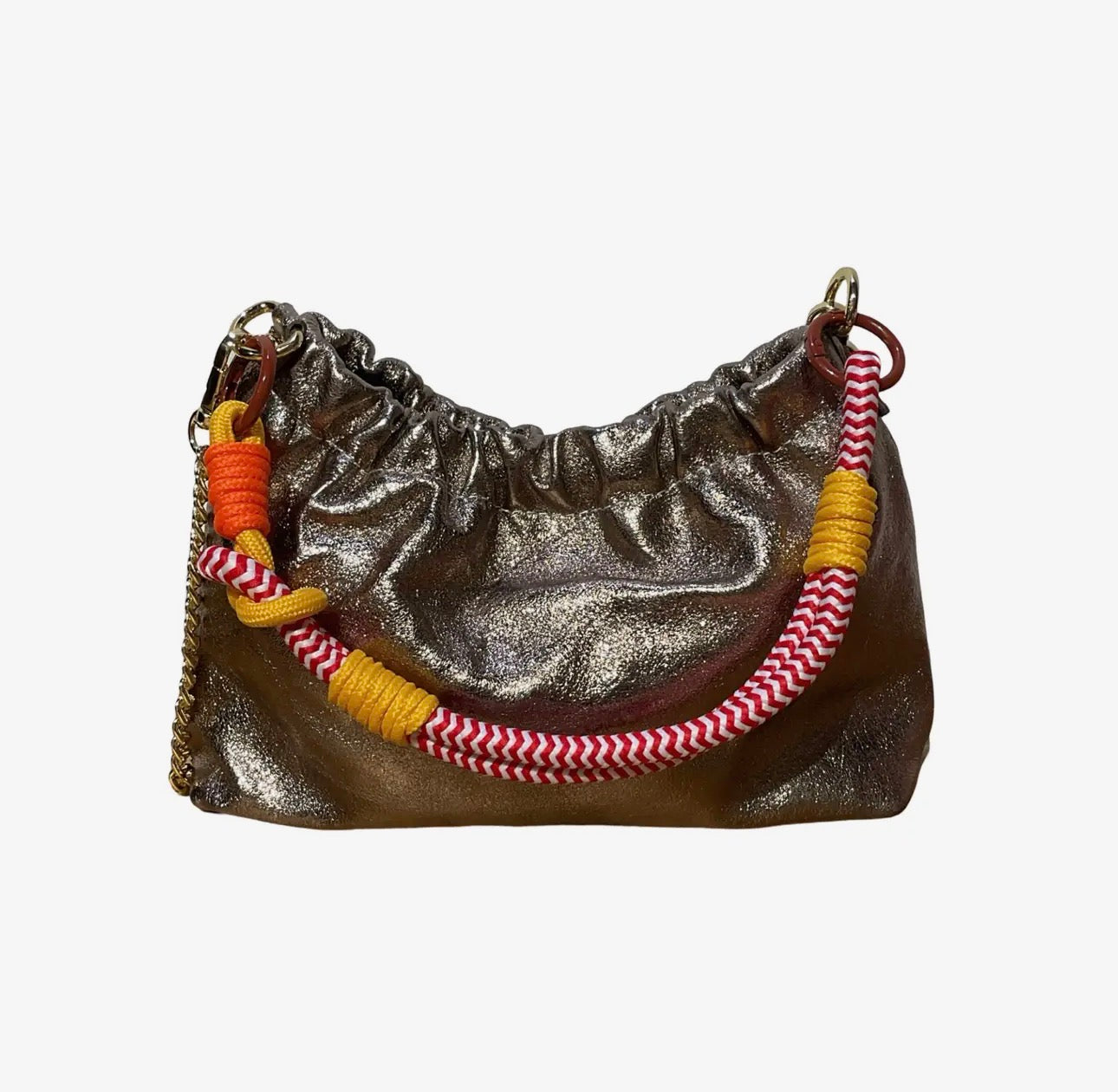 • Rope shoulder strap plus a removable chain for hand, shoulder, or crossbody carry