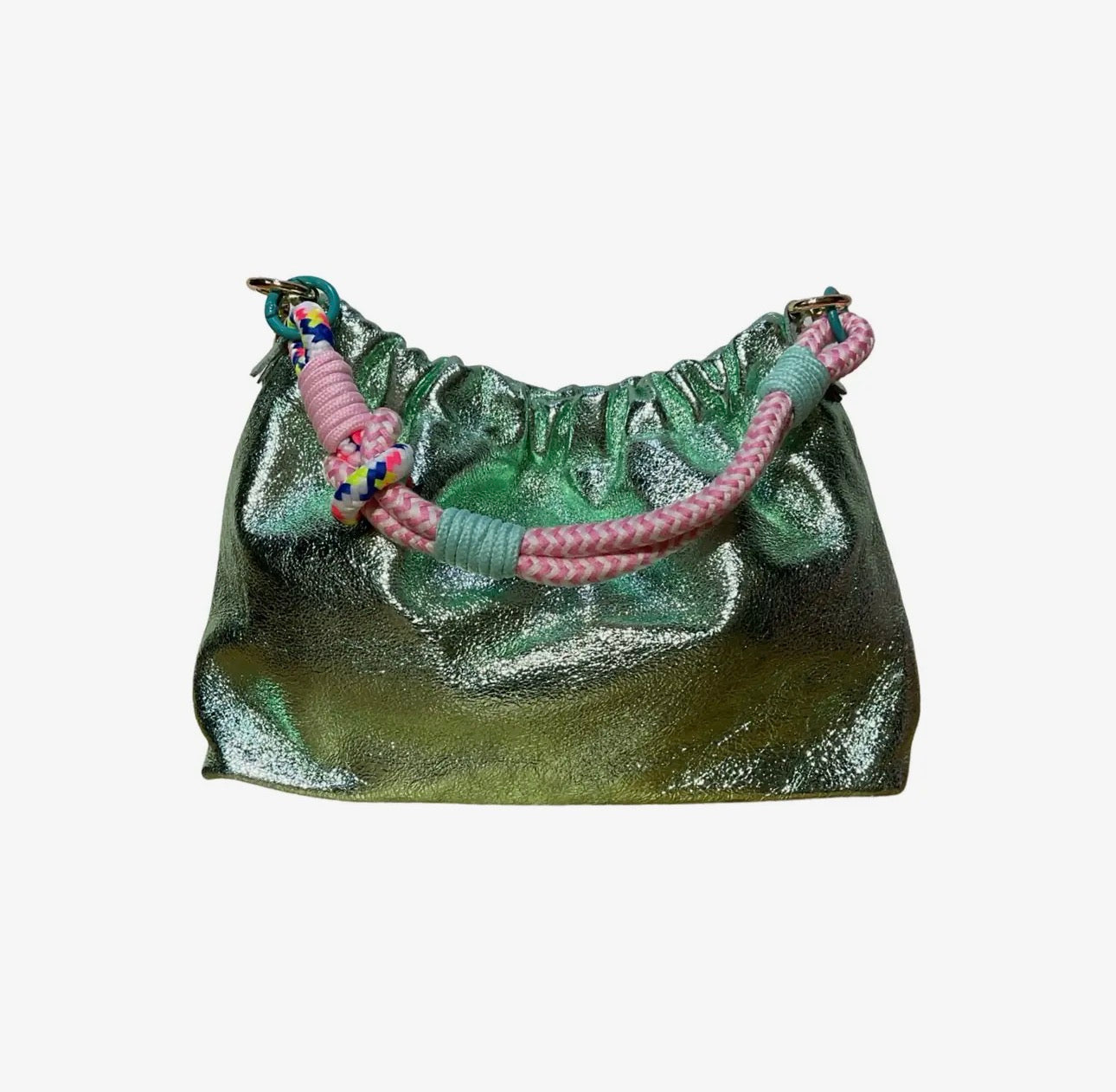The metallic mint finish gives the Stevie a fresh, playful energy — a cool-toned pop of colour that lifts any outfit. Pair it with whites, creams, and soft neutrals for a summery look, or let it contrast against deeper tones for something more unexpected. Carry it by hand or clip on the chain for effortless crossbody style.