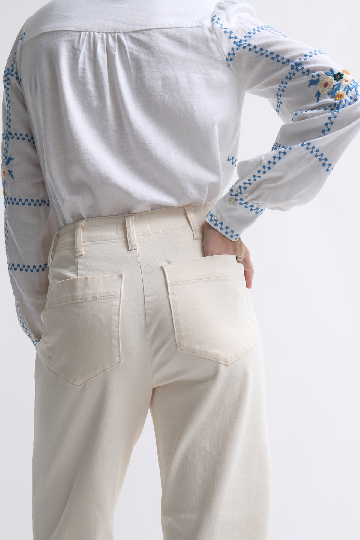 The Carol Shirt in Coconut White is a versatile wardrobe essential by Kireina, designed to pair effortlessly with any denim. This refined piece features a classic button-front silhouette with a graceful round collar, elevated by intricate embroidery detailing that adds visual interest without compromising its understated elegance. Perfect for creating polished, everyday looks with minimal effort.