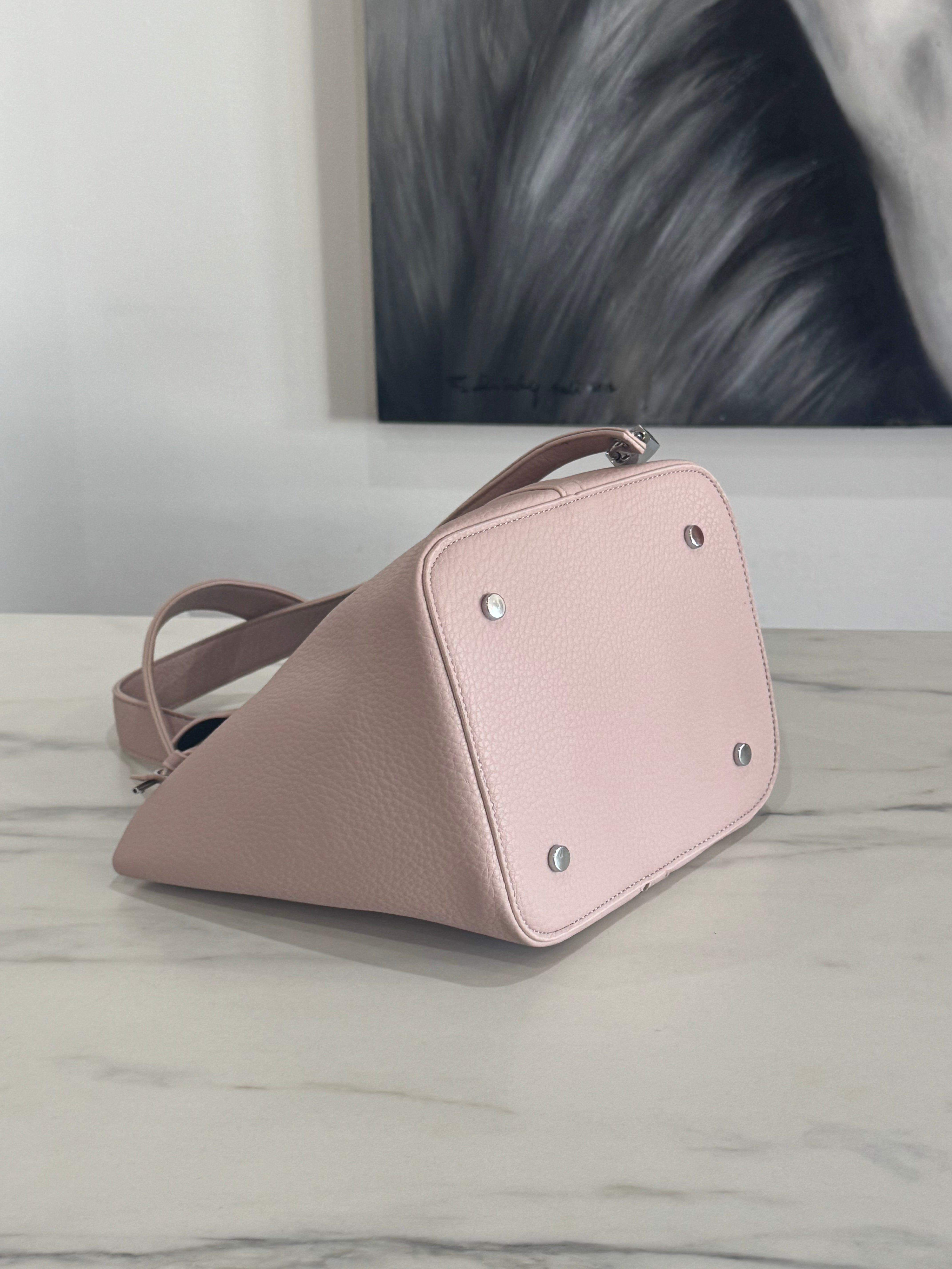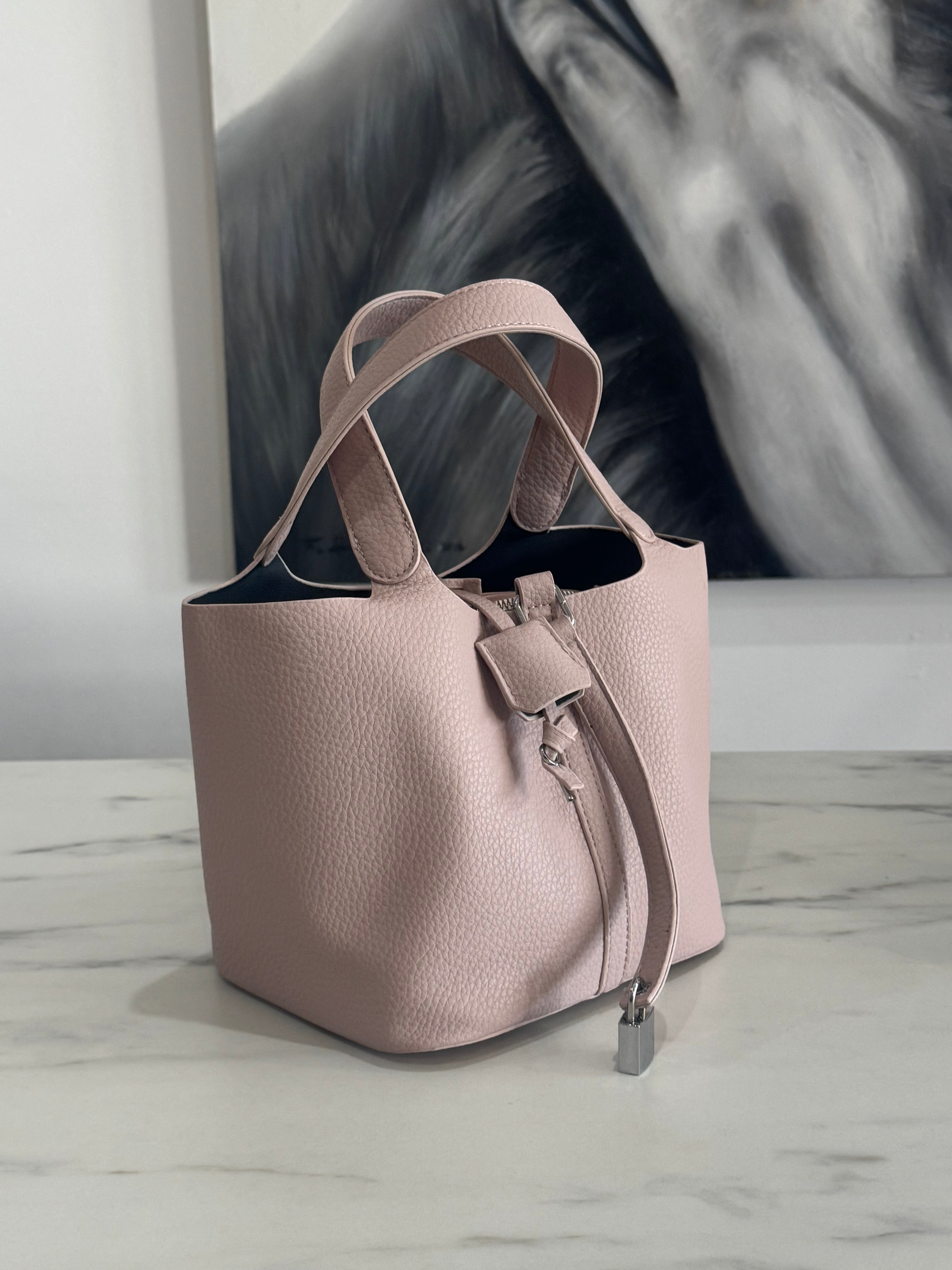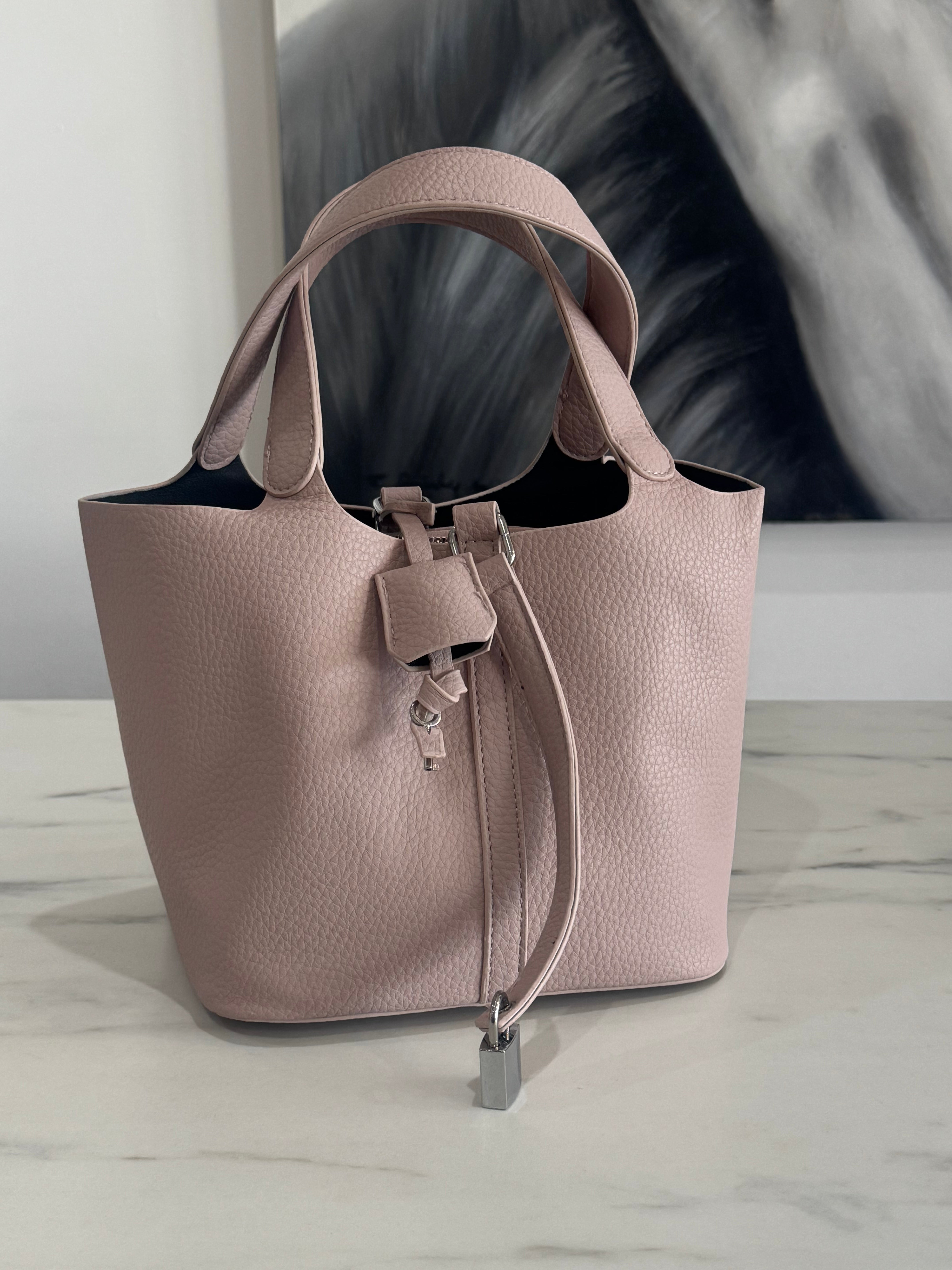 The Allegra Locket Bucket Bag in Pale Pink is your new stylish sidekick. Crafted from high-quality PU leather, it features a separate zip removable compartment perfect for organizing your essentials. With double handles for easy carrying and a chic silver padlock with key, it’s ideal for brunch dates, workdays, or weekend outings. Add a touch of playful elegance to any outfit with this versatile bucket bag!