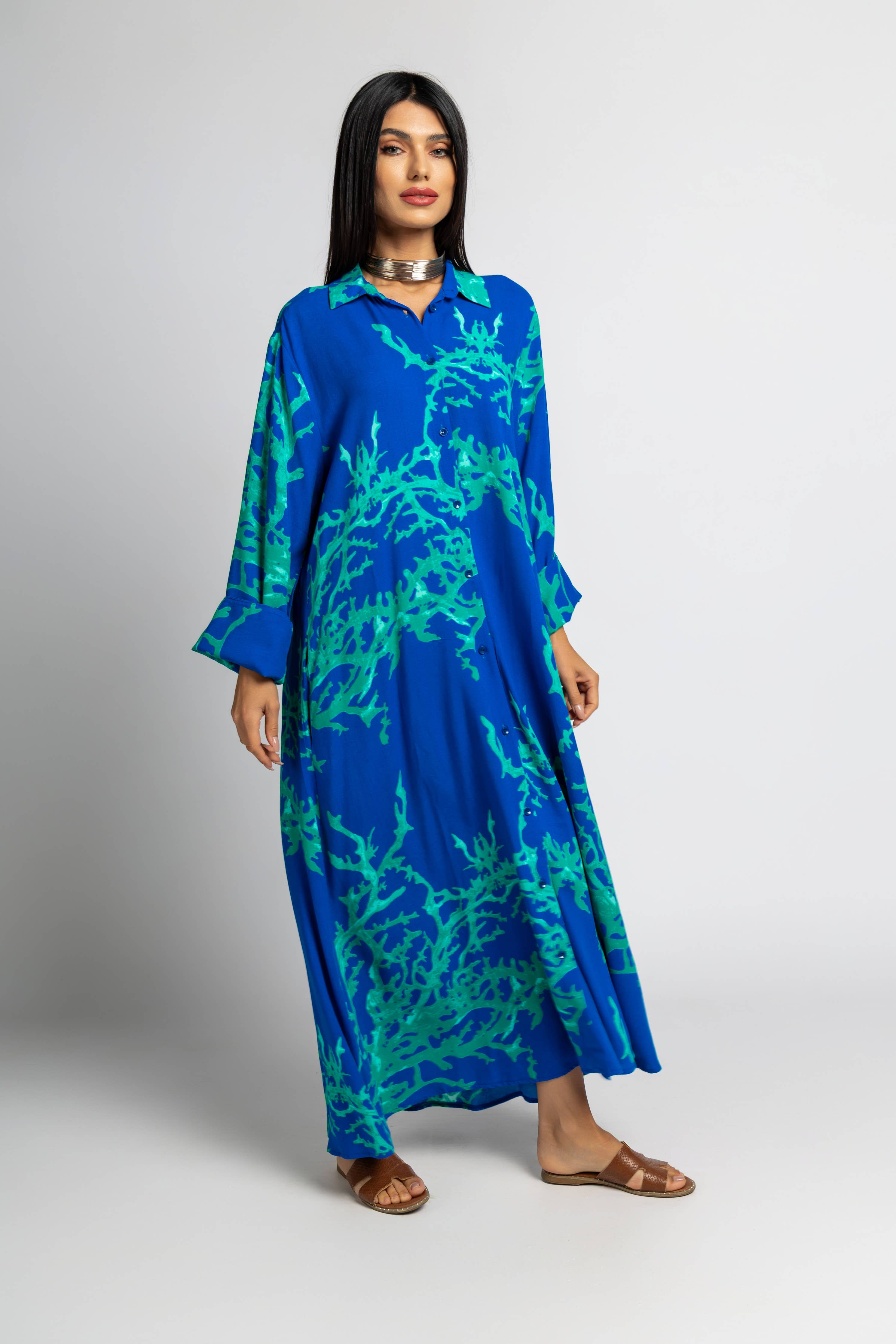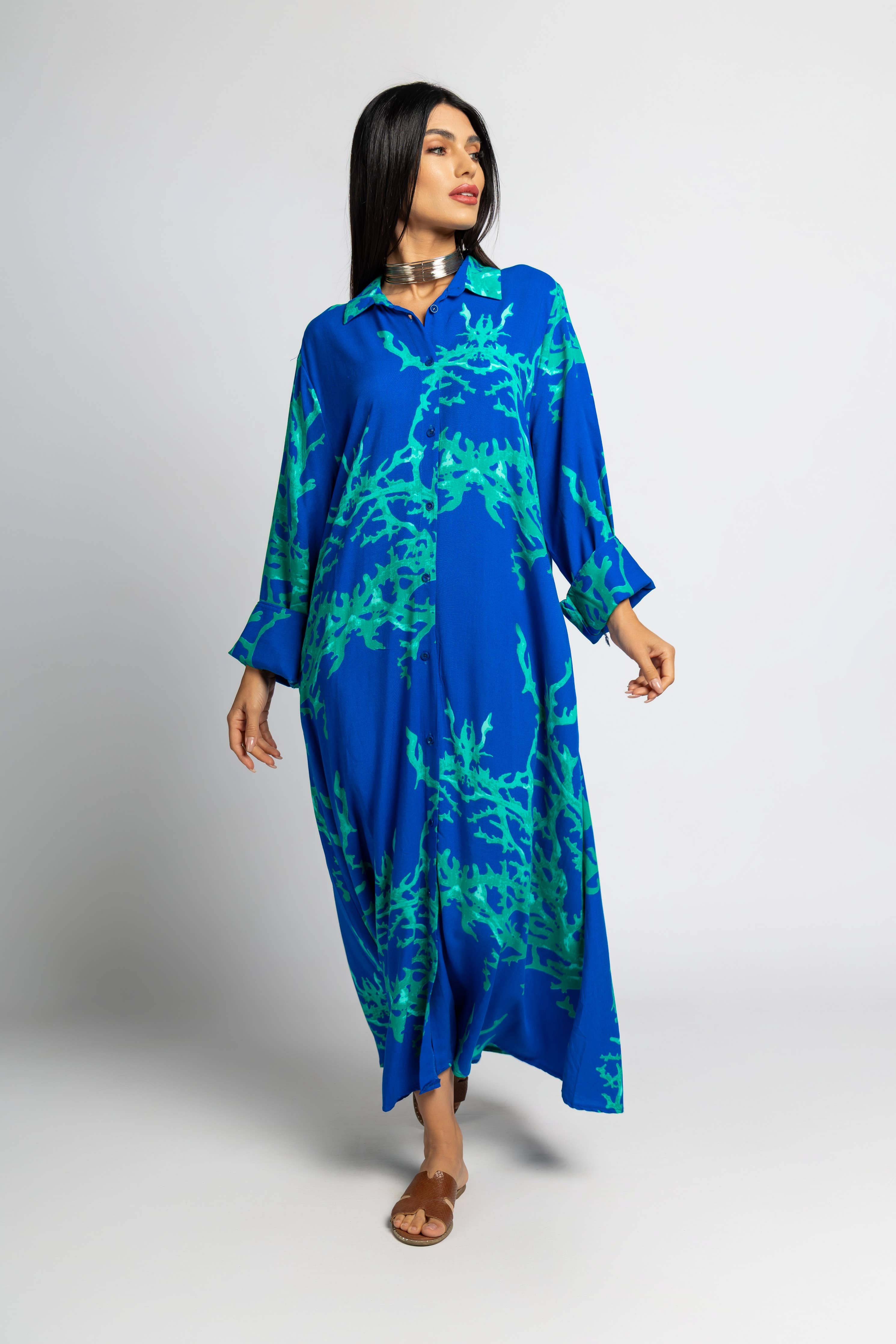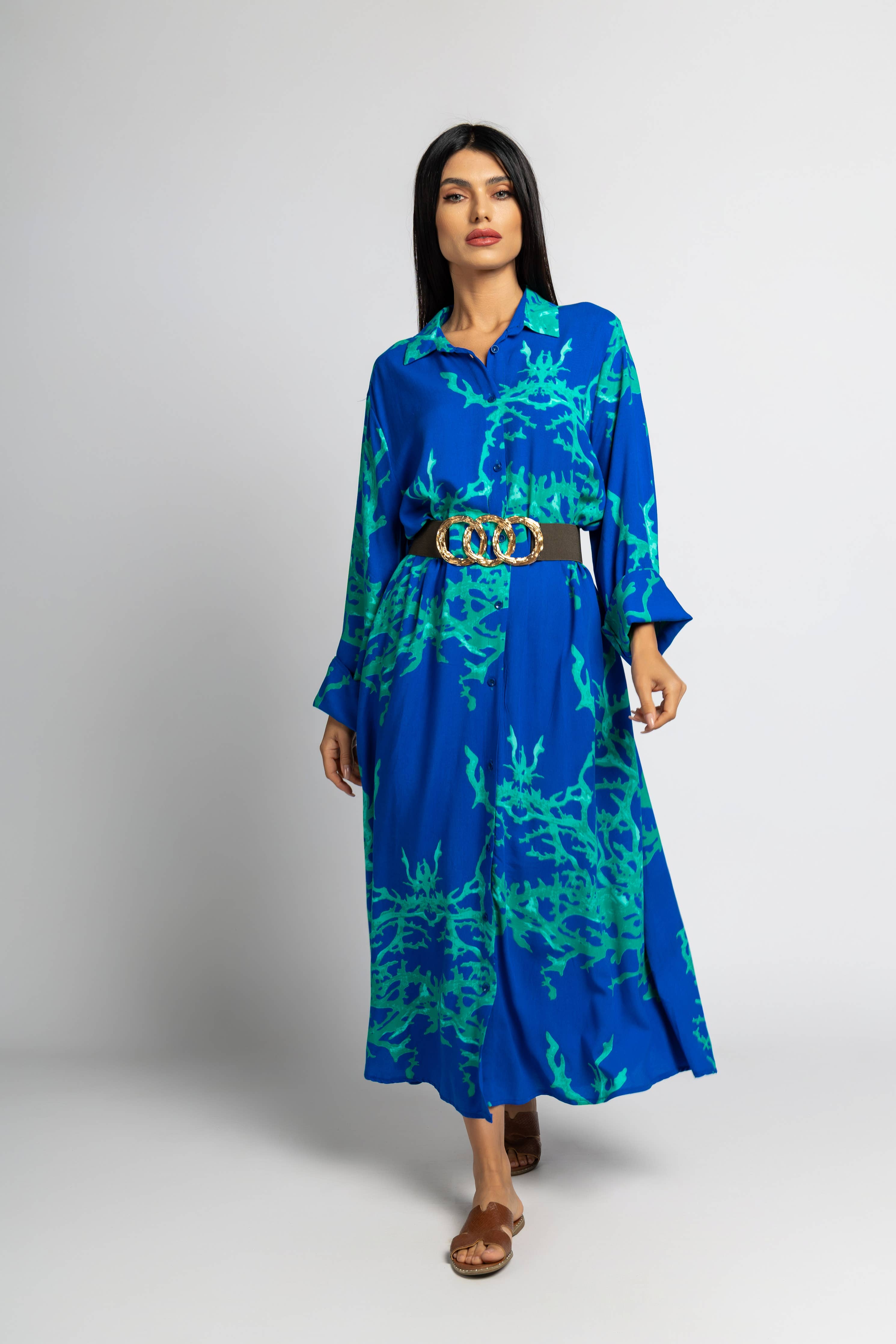 This coral-print shirt dress, crafted from soft viscose, offers a comfortable fit with a classic collar, full-length buttons, and practical pockets. Designed in Greece, it can be styled as a dress or worn open like a kimono, providing versatile options for summer wardrobes. Accessories and belts are sold separately.