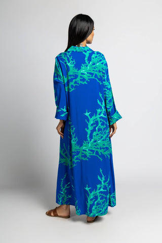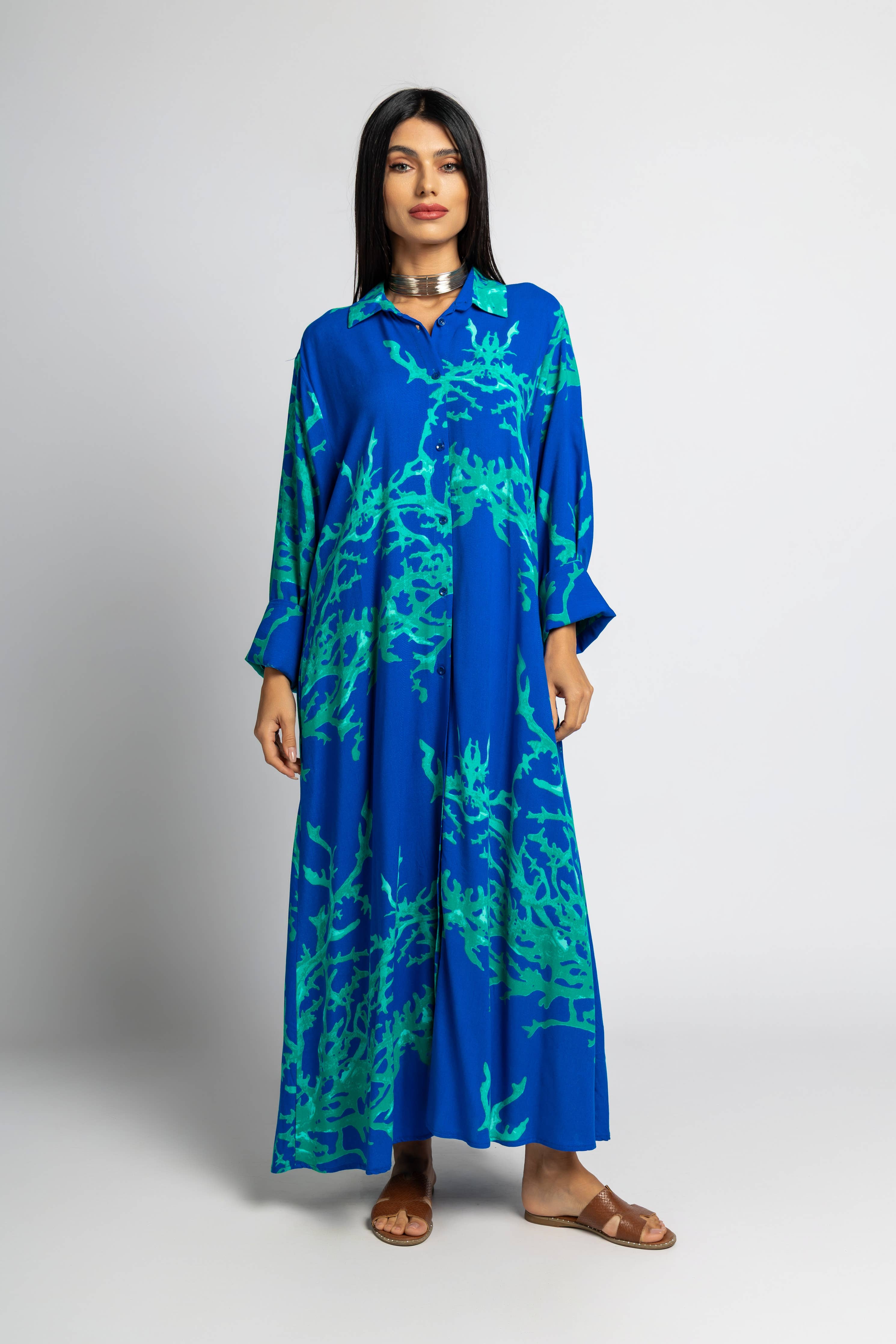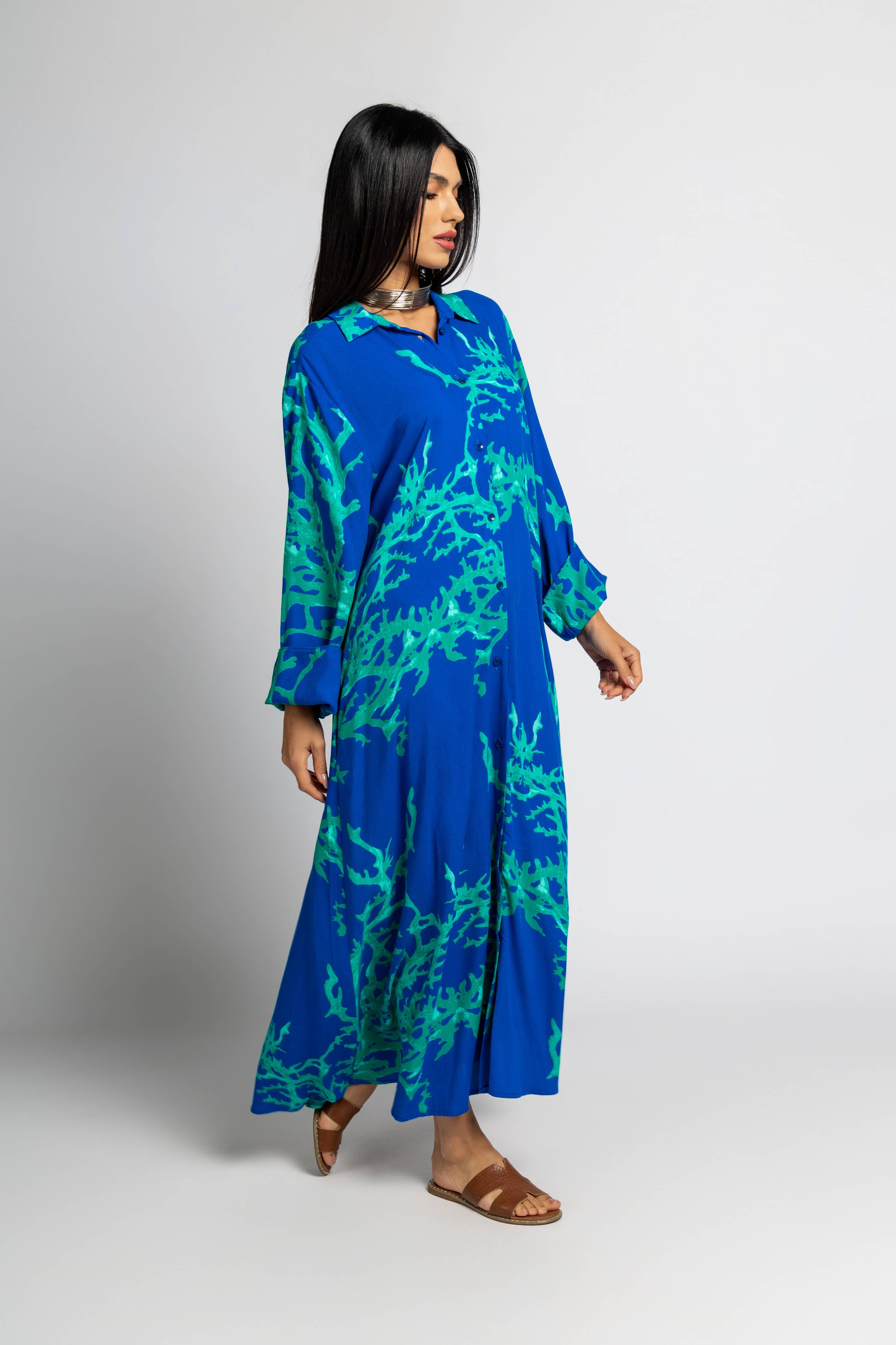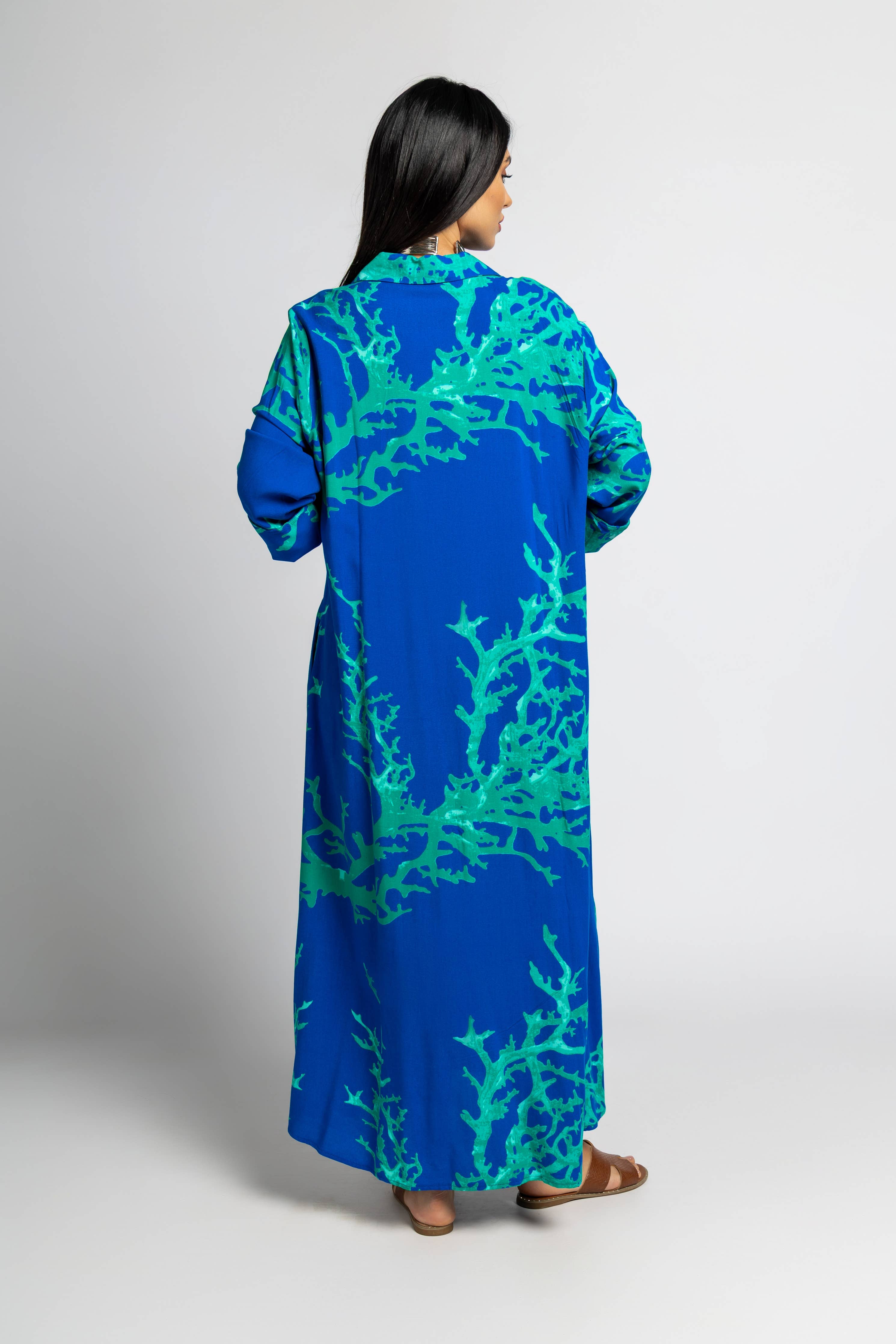 This coral-print shirt dress, crafted from soft viscose, offers a comfortable fit with a classic collar, full-length buttons, and practical pockets. Designed in Greece, it can be styled as a dress or worn open like a kimono, providing versatile options for summer wardrobes. Accessories and belts are sold separately.